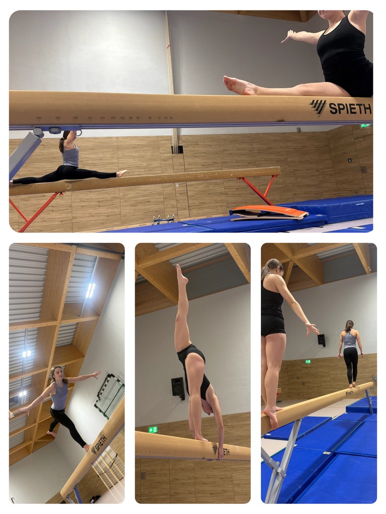 Balken: Auf dem schmalen Balancebalken (nur 10 cm breit!) werden Elemente aus Gleichgewicht, Akrobatik und Tanz gezeigt. Konzentration und Körperbeherrschung sind hier besonders wichtig.